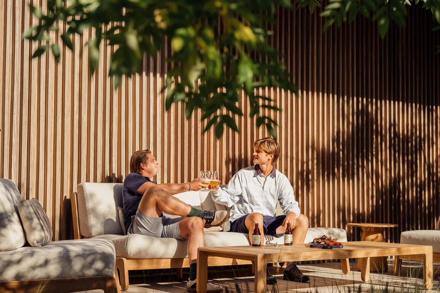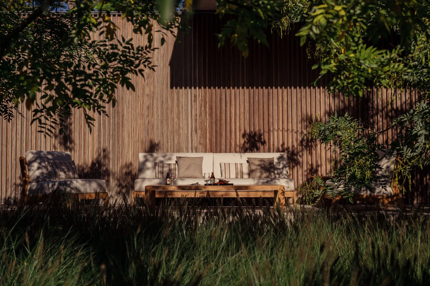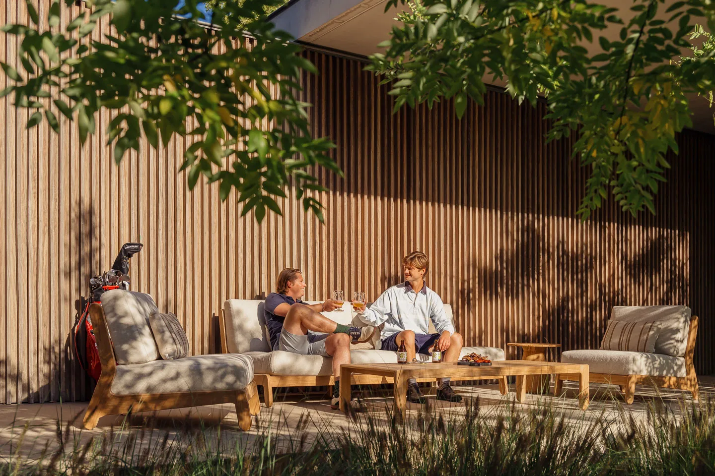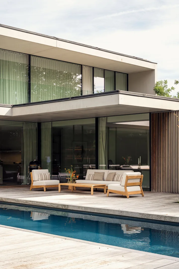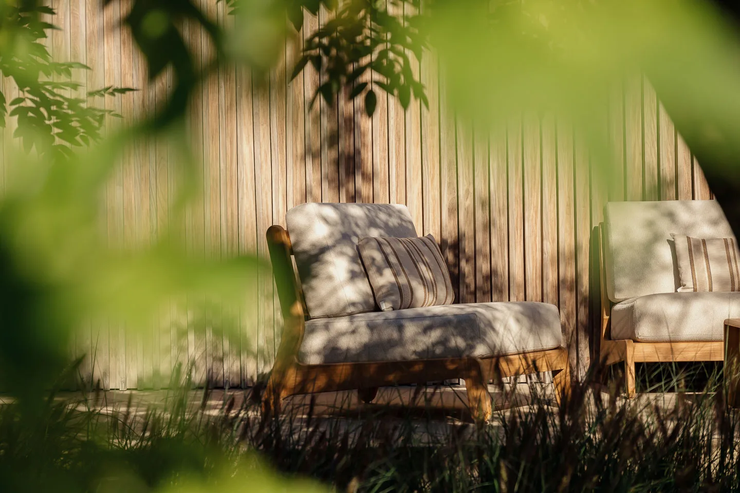 Le fauteuil GRACE combine une structure en teck naturel avec des coussins confortables en tissu oléfine. Son assise profonde et son dossier incliné permettent de profiter d’un moment de détente dans un salon de jardin haut de gamme.