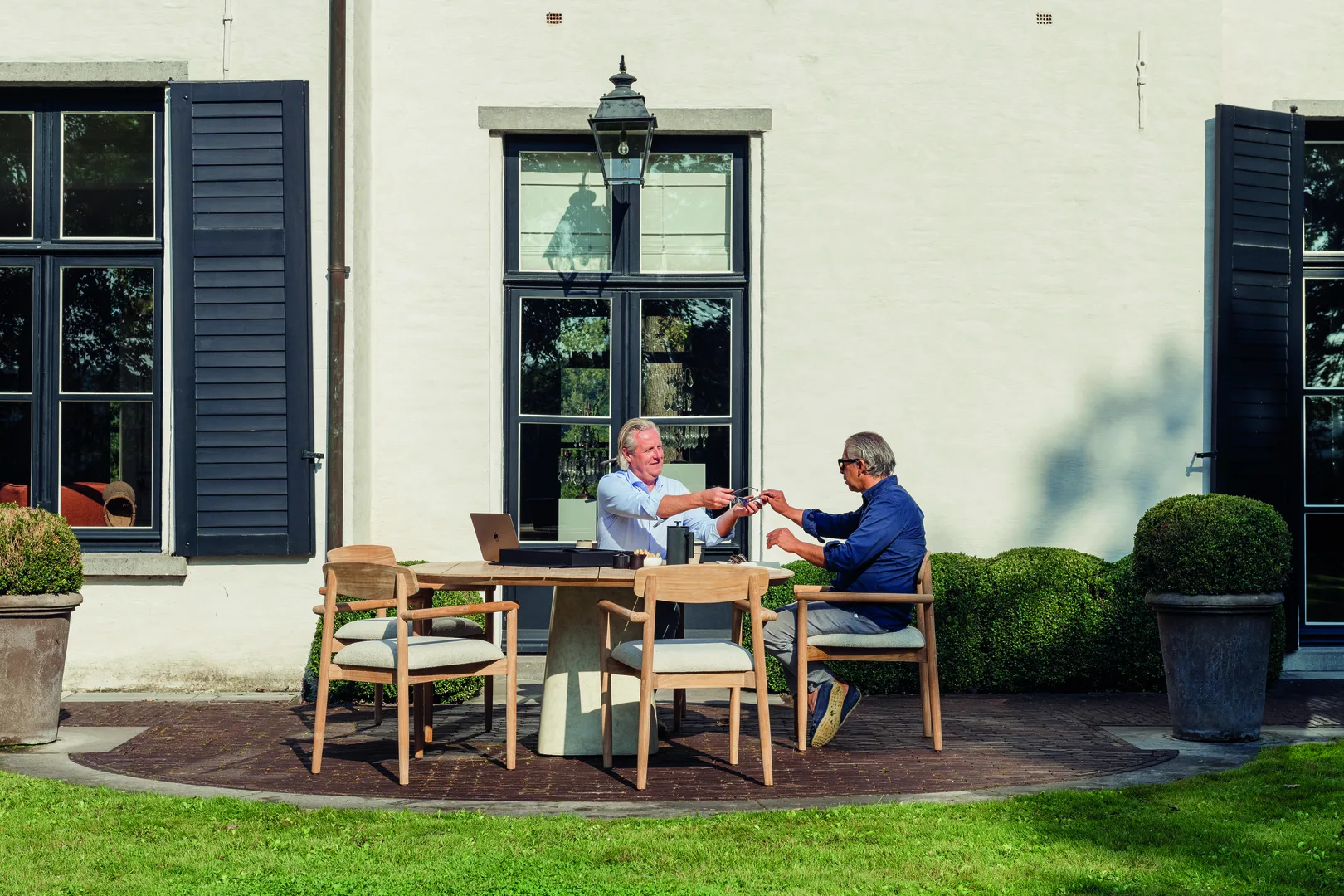 Il s’intègre parfaitement dans un salon de jardin haut de gamme ou autour d’une table de repas extérieure.