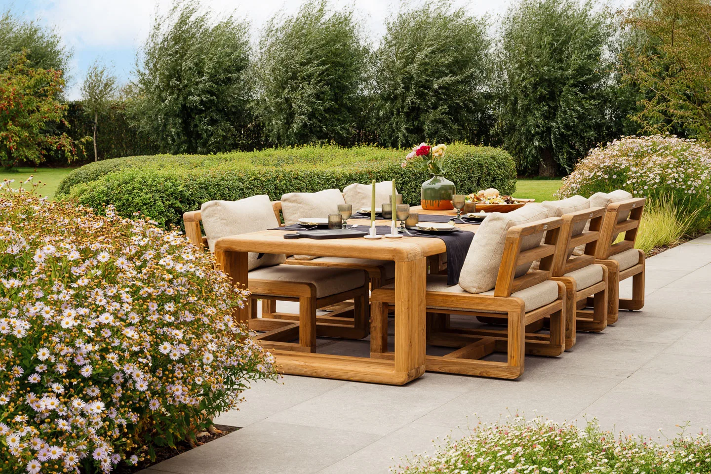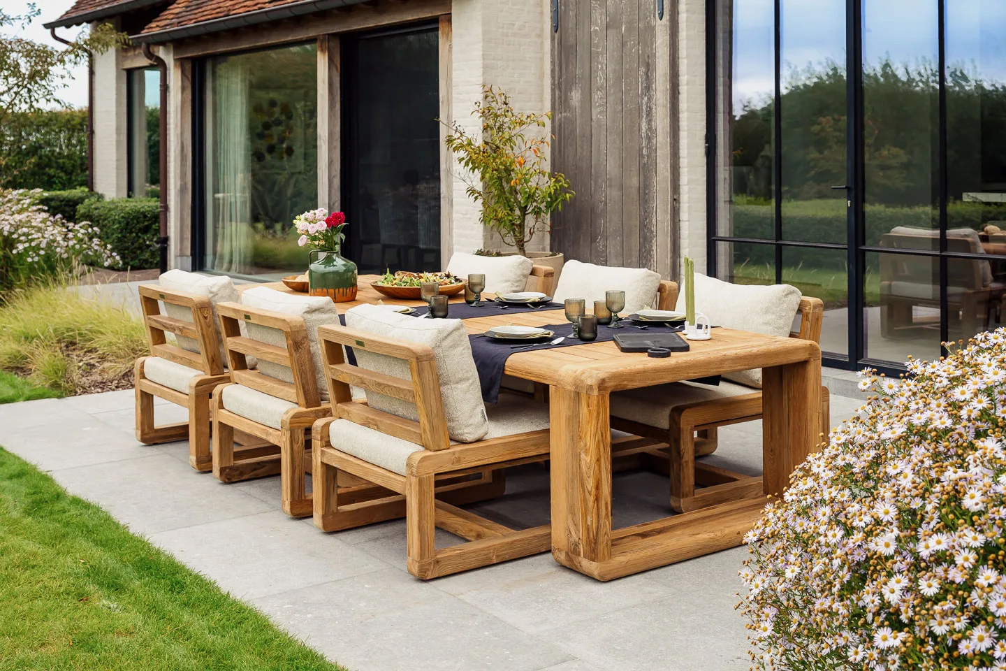 Nettoyez avec une éponge douce et de l’eau savonneuse. Appliquez régulièrement une huile de teck pour préserver le bois. Protégez le mobilier avec une housse adaptée pendant l’hiver.