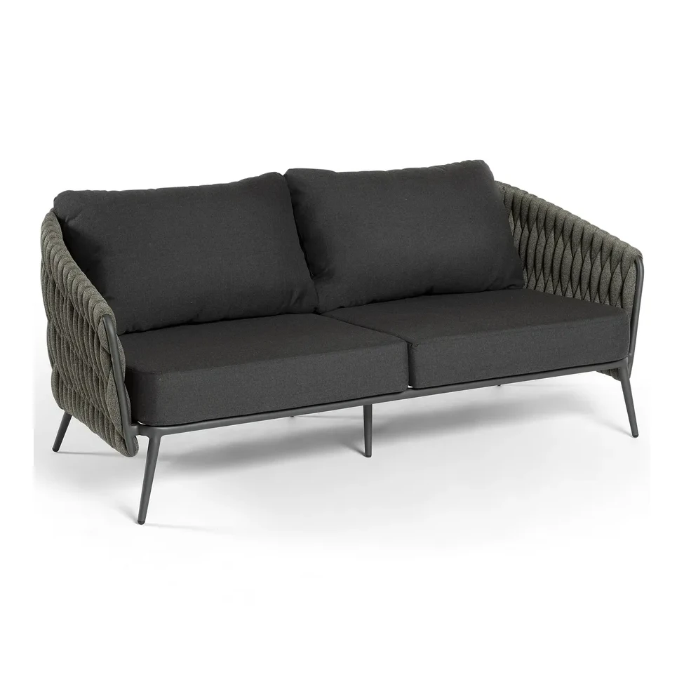 Structure aluminium thermolaqué (charcoal ou blanc). Coussins tissu Sunbrella haute qualité, résistants aux UV et aux intempéries, mousse à séchage rapide, déhoussables.