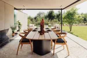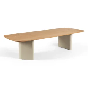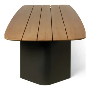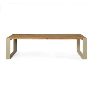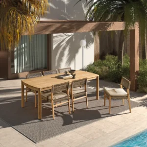 La table de jardin Tunis se distingue par sa fabrication entièrement en teck, un bois réputé pour sa résistance naturelle aux intempéries. Son design simple et élégant s’intègre parfaitement dans tous les styles d’aménagement extérieur.
